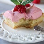 Mjuk vaniljkaka med vispad hallonpannacotta. Så fräsch. Så enkelt att göra och så enkelt att variera. Jag går redan runt och funderar på nästa smakkombination. Något med choklad. Botten är ju den samma som till min citronkaka med mascarponekräm. Pannacottan gjorde jag på gelesocker Multi, inget animaliskt gelatin.