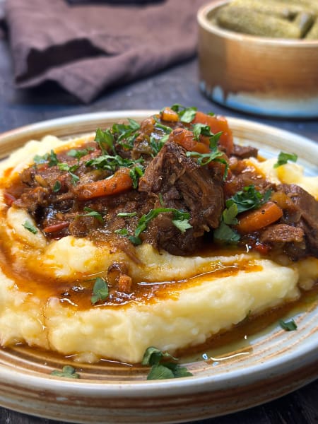 - Sätt på lock och låt puttra på spisen eller i ugnen i minst en timme eller tills köttet är riktigt mjukt.