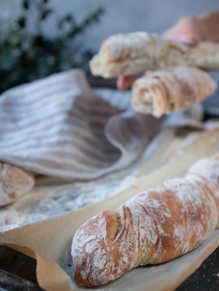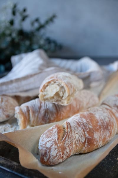 - Upprepa samma procedur med resterande deg. Låt baguetterna jäsa under en kökshandduk i 15 minuter.